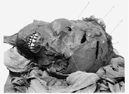presentes en su momia, pues presenta heridas detrás de la oreja, la nariz y la