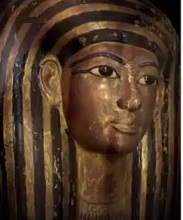 En cuyo interior se puede ver la momia con su máscara funeraria.